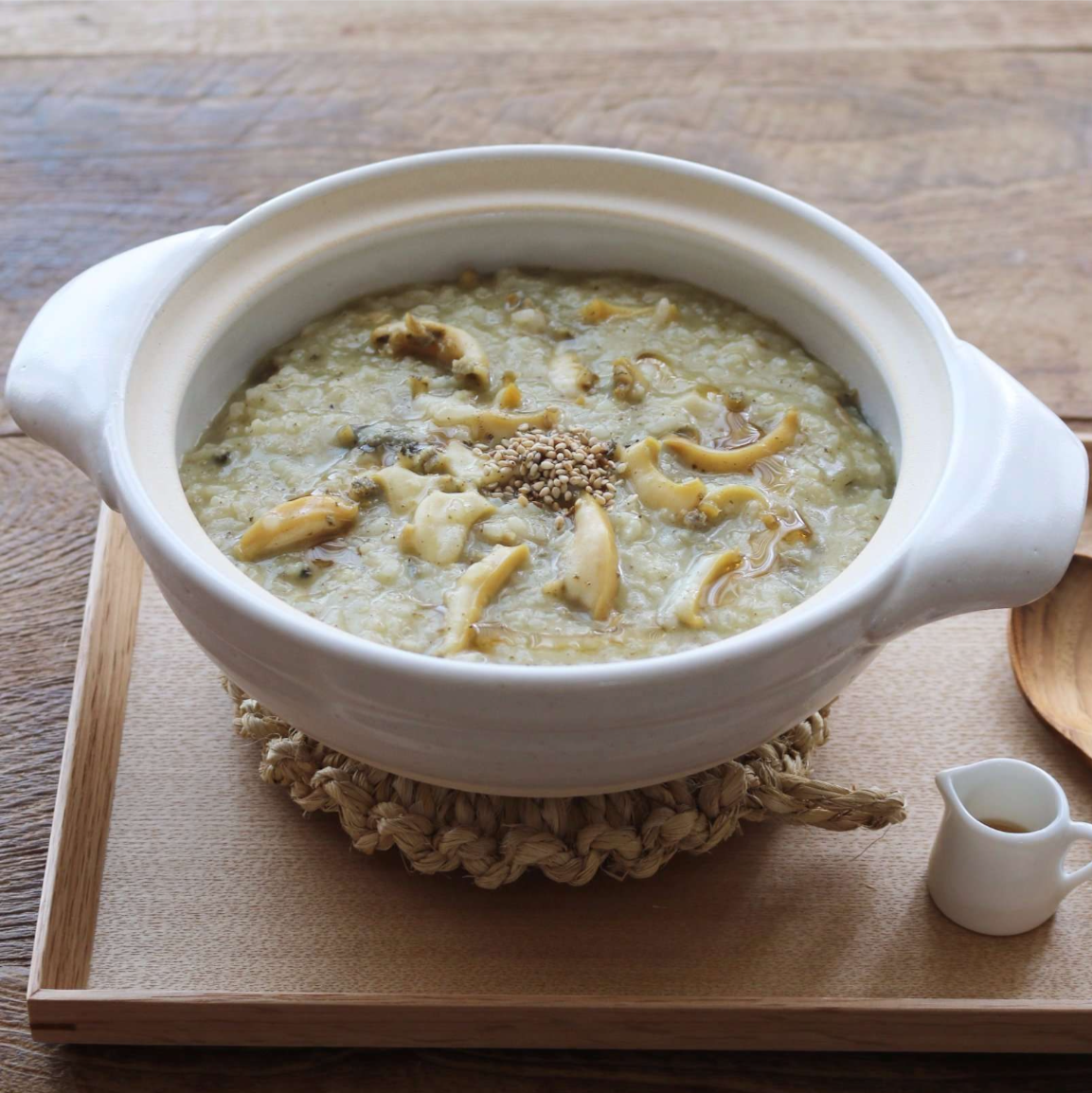 Made by stir-frying fresh abalone with glutinous rice and sesame oil, then gently simmered to a smooth and savory texture.